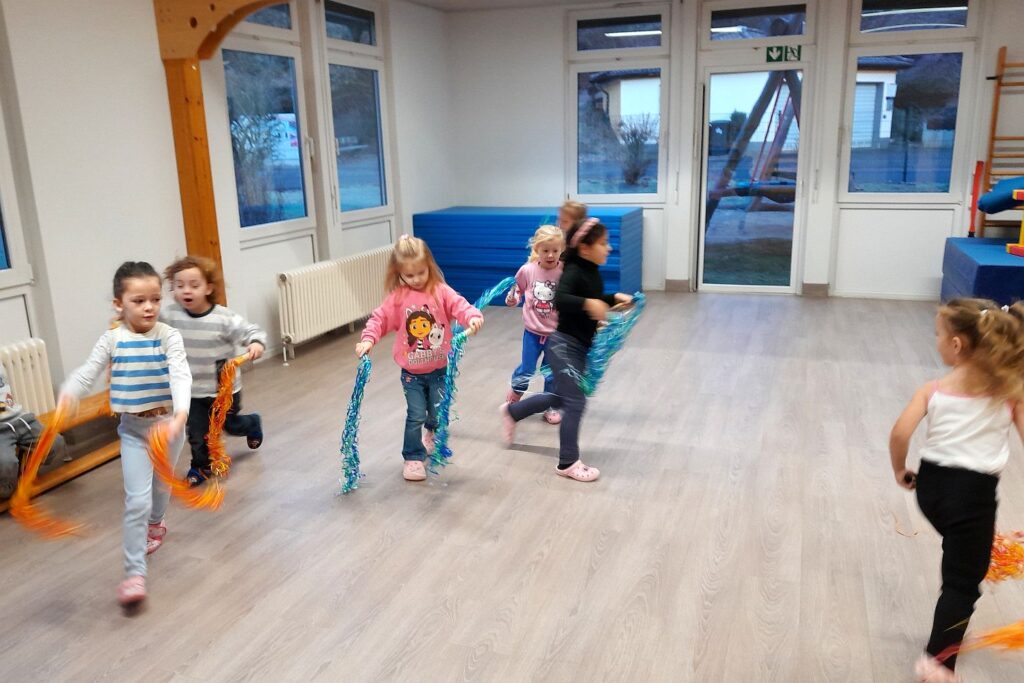 Auch die Bänder kamen zum Einsatz: Mit schwungvollen Bewegungen, Drehungen und Tänzen entstanden bunte Muster in die Luft. Die Kinder konnten dabei ihrer Fantasie freien Lauf lassen und ein Gefühl für Rhythmus und Raum entwickeln. Psychomotorik fördert nicht nur die motorischen Fähigkeiten, sondern stärkt auch das Selbstvertrauen, die Wahrnehmung und die Freude an Bewegung. Die Kinder waren mit Begeisterung dabei und hatten sichtbar viel Spaß an den abwechslungsreichen Bewegungen.